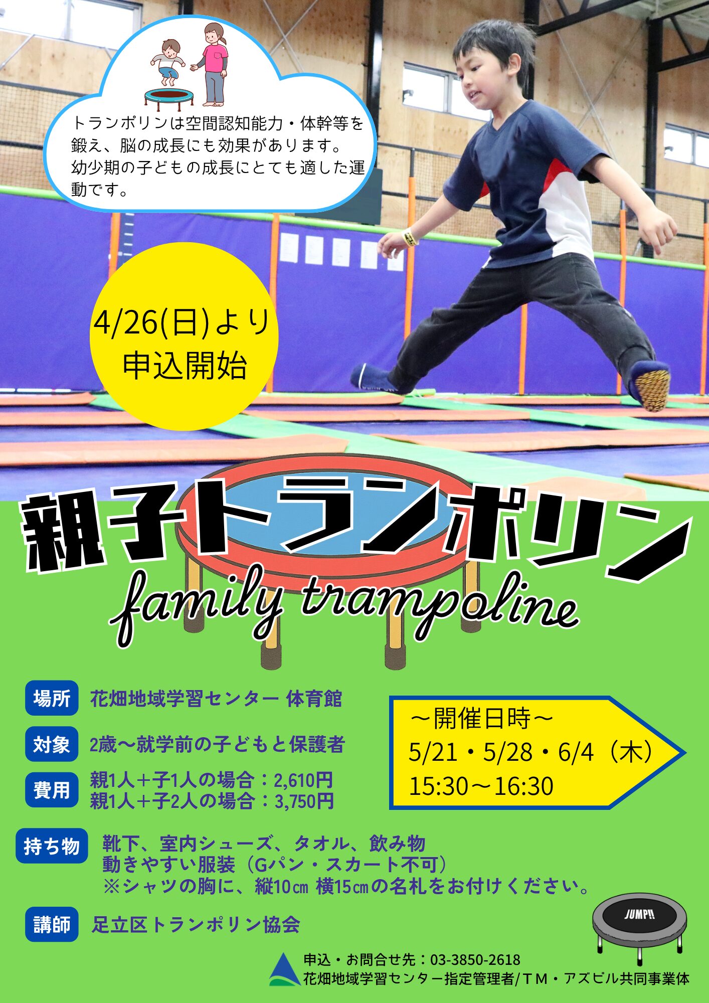 親子で一緒にトランポリンを跳びましょう!基本的な跳び方に加え、トランポリンに慣れるため、遊びを取り入れた運動も行います。