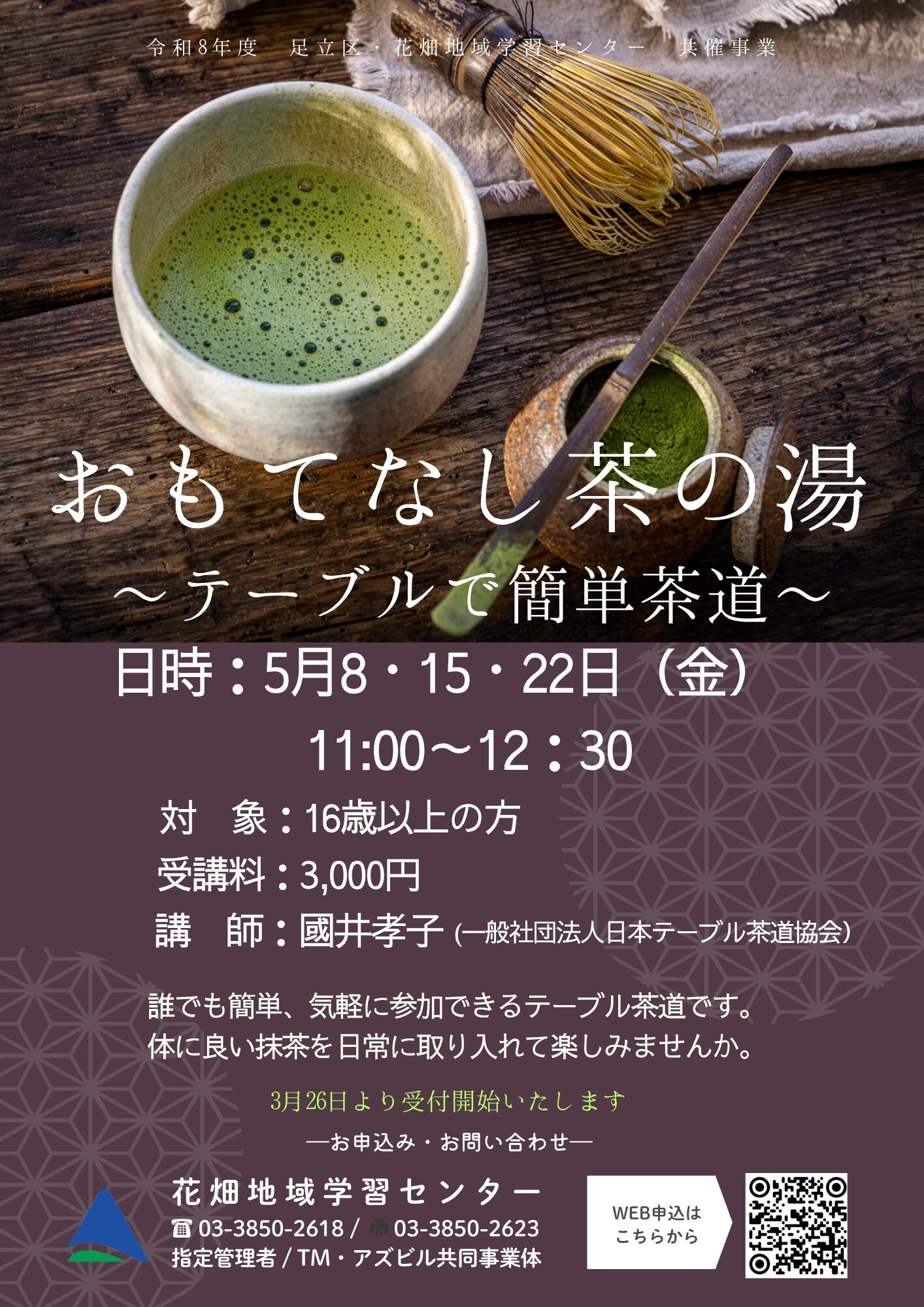 【3/26受付】おもてなし茶の湯~テーブルで簡単茶道~(3日制)