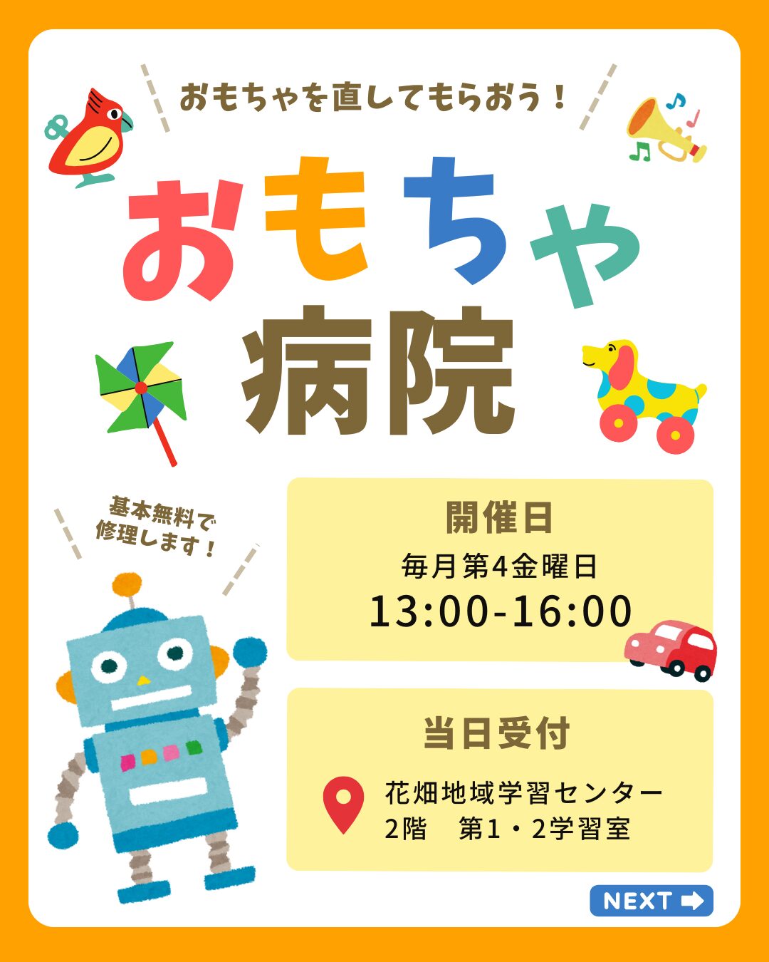 壊れてしまったり動かなくなったりした「おもちゃ」を基本無料で修理します。