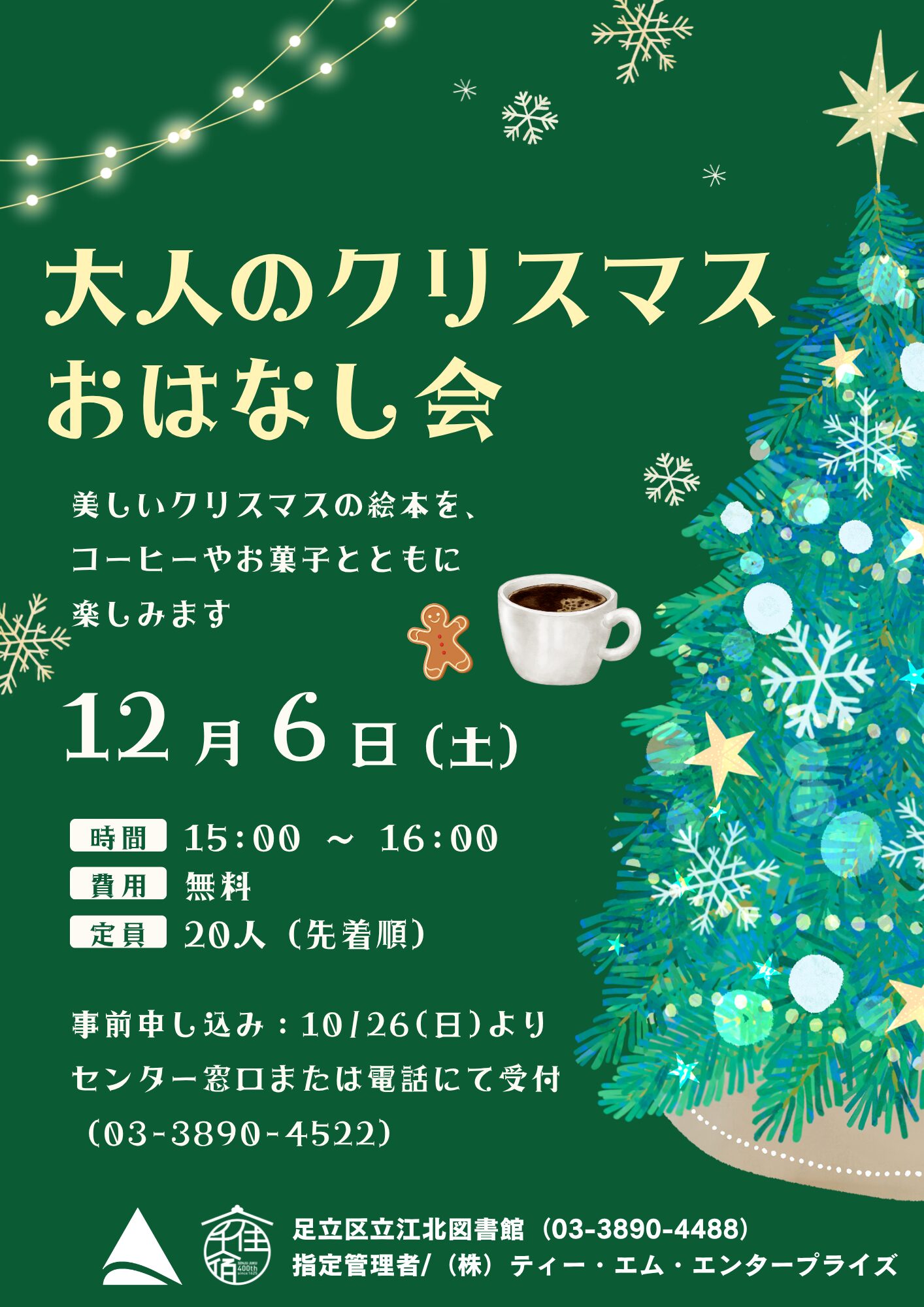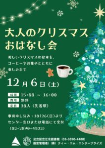 大人の方のためのおはなし会です。コーヒーやお菓子とともに、クリスマス絵本の世界をお楽しみください。