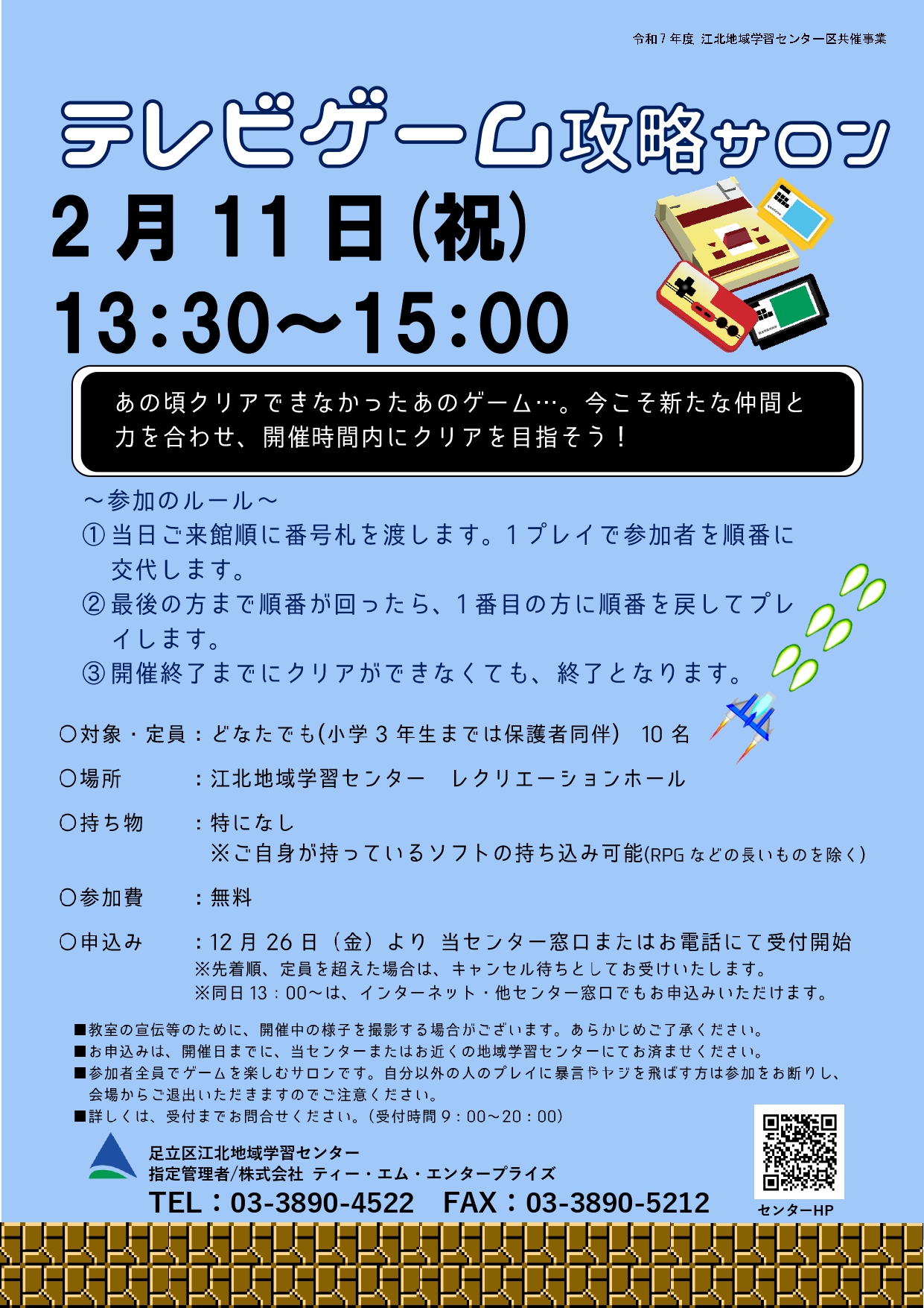昭和時代の懐かいテレビゲームソフトを使い、参加者で協力しながら、開催時間内でクリアを目指します。ご自身が持っているソフトの持ち込みも可能です(RPGなどの長いものを除く)。