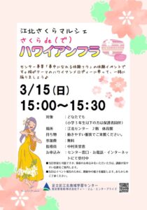 江北さくらマルシェ2026のイベントです。江北センターで定期開催している「夢中になれる体験フラ」講師の指導のもと、フラダンスの体験ができます。桜にちなんだ曲のハワイアンメロディーに合わせて、かんたんな振り付けで踊ります。