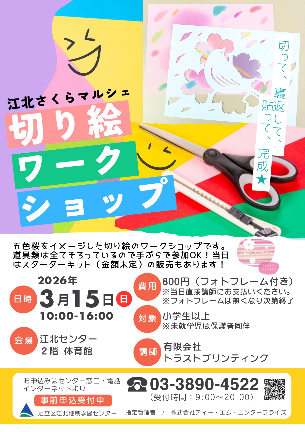 江北さくらマルシェ2026のイベントです。区内企業「有限会社 トラストプリンティング」による、五色桜をイメージした切り絵のワークショップです。
