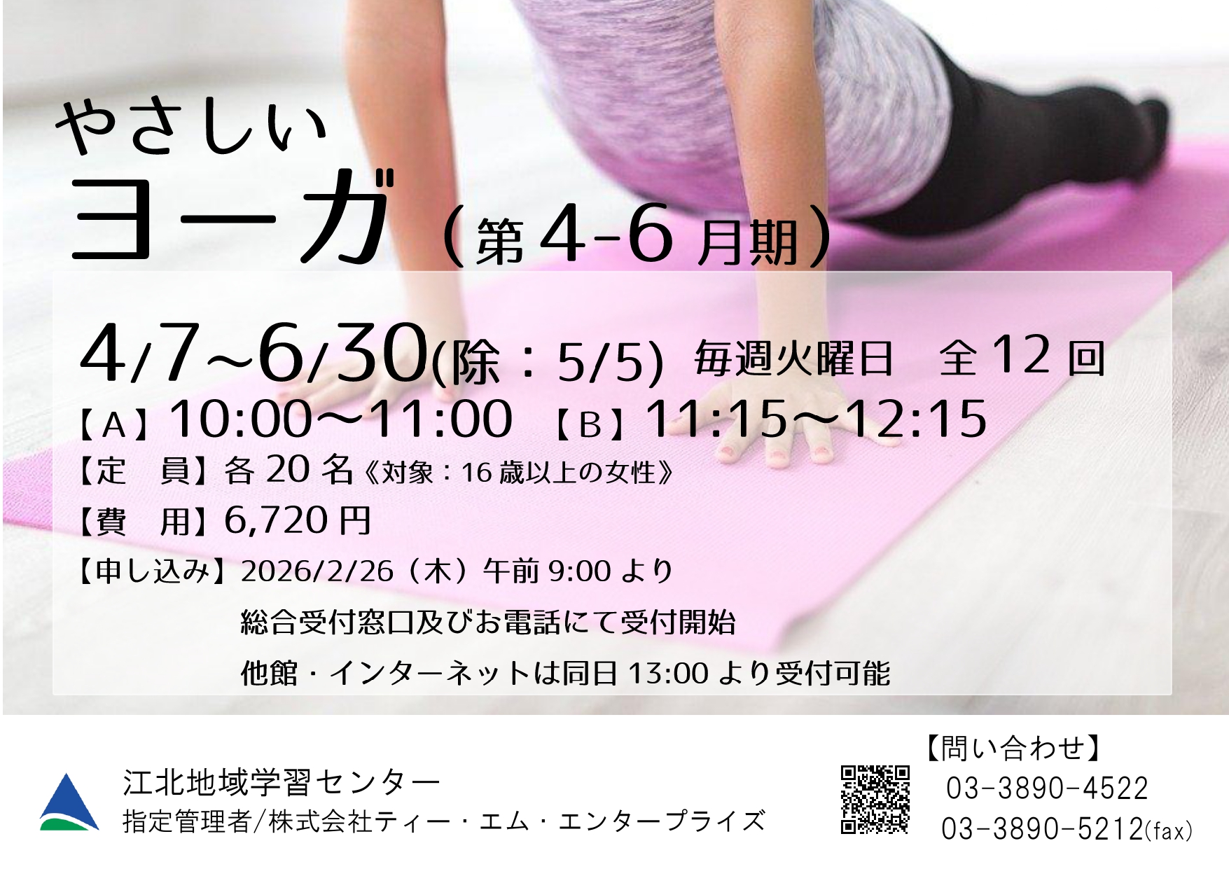 令和8年4月7日~6月30日の毎週火曜日(除:5月5日) A:午前10時~11時 B:午前11時15分~午後0時15分
