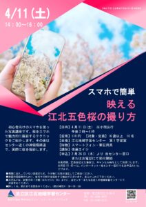 初心者向けのスマホを使った写真講座です。桜をより魅力的に撮影するテクニックをご紹介します。当日は実際にセンターそばの神領堀緑道で実際に撮影ワークショップも行います。撮った写真はセンターで行う五色桜フォトコンテストにもご応募いただけます。