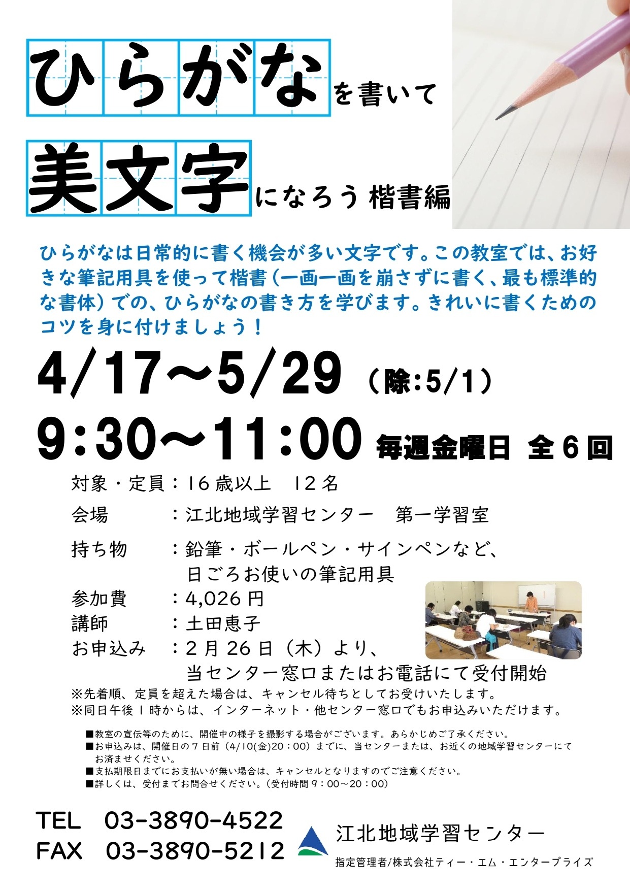 【2月26日受付開始】ひらがなを書いて美文字になろう 楷書編(6日制)