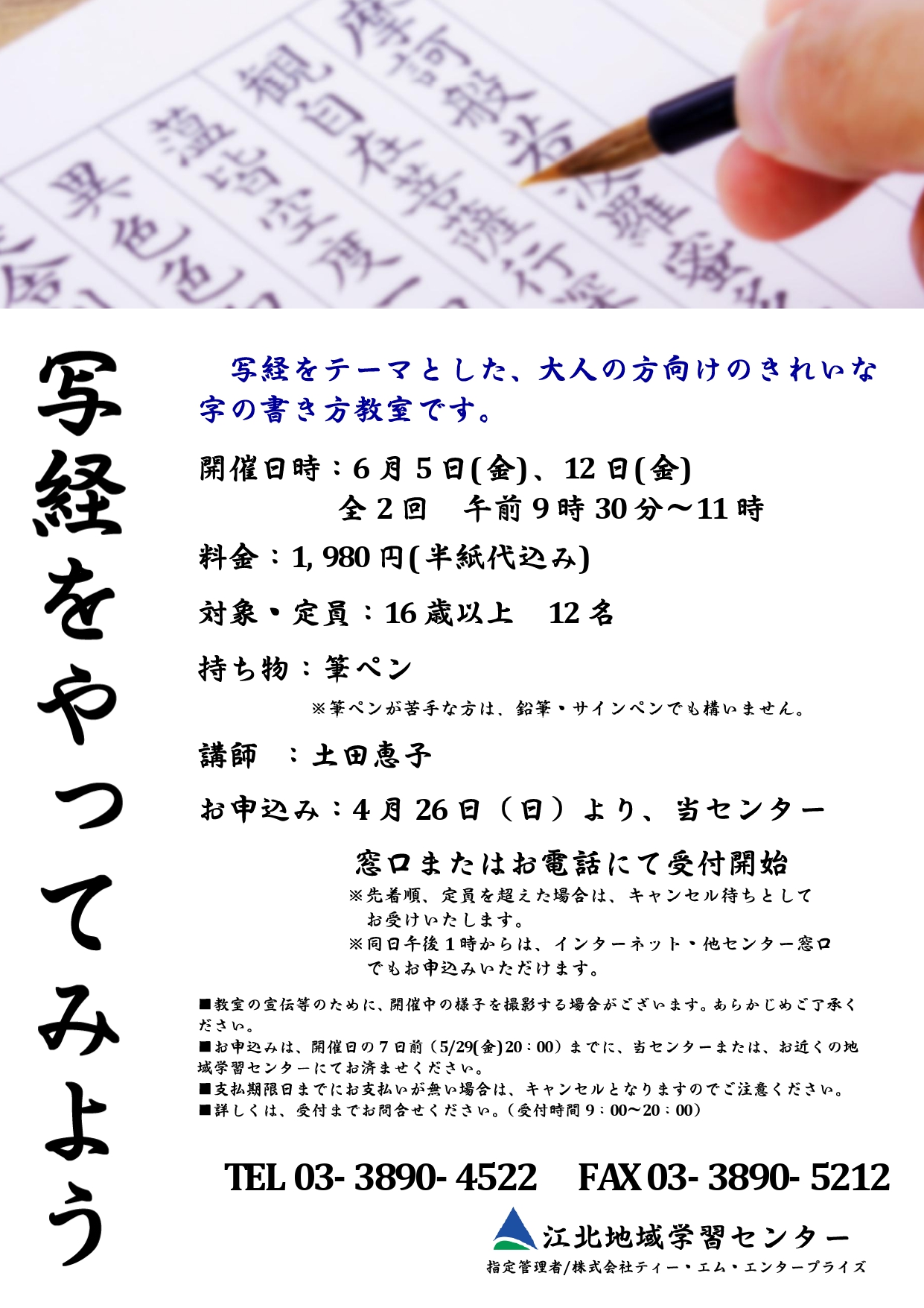 大人の方向けの字の書き方教室。写経をしながら、書く時の姿勢・きれいに書くためのコツを教わります。