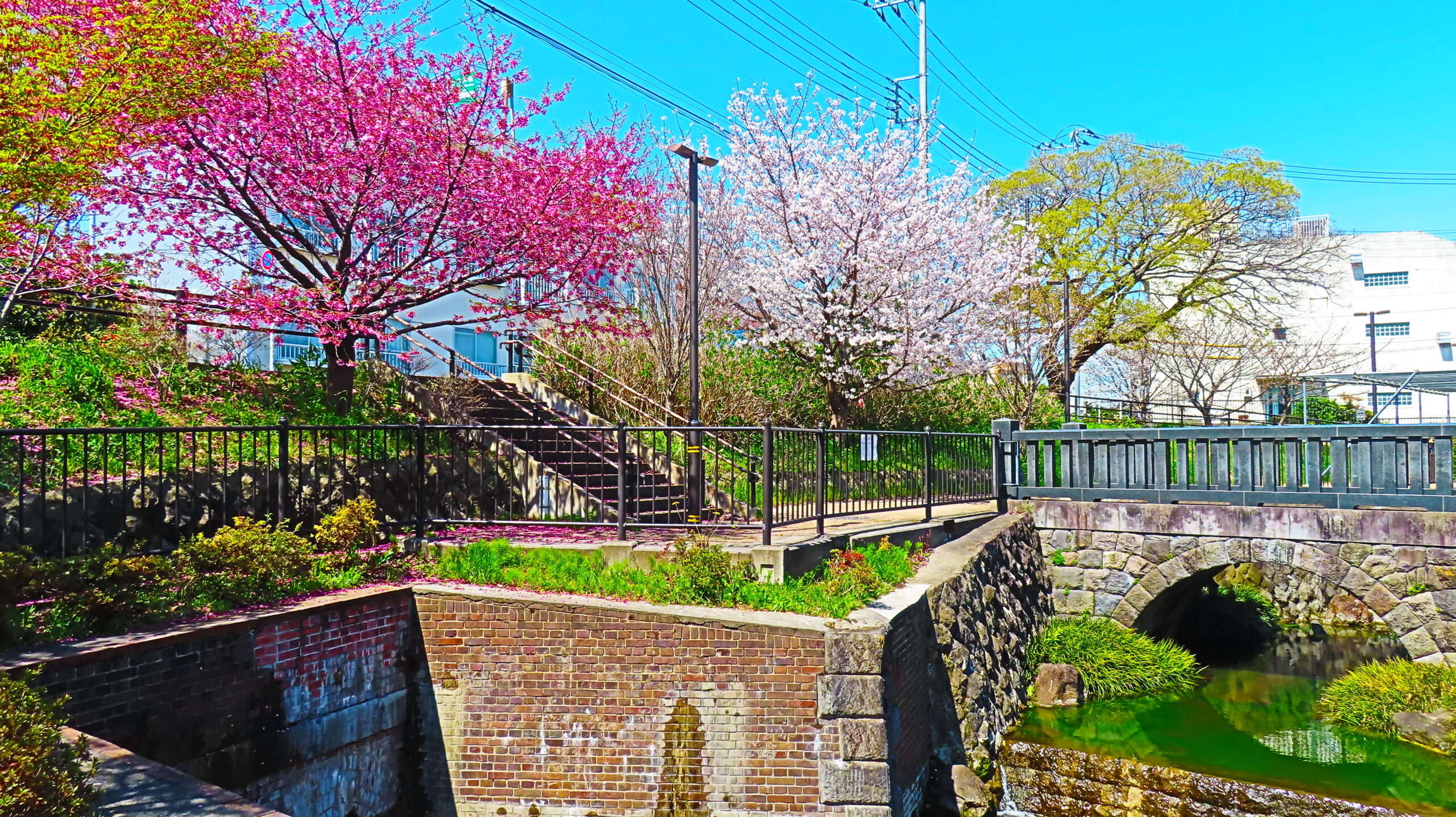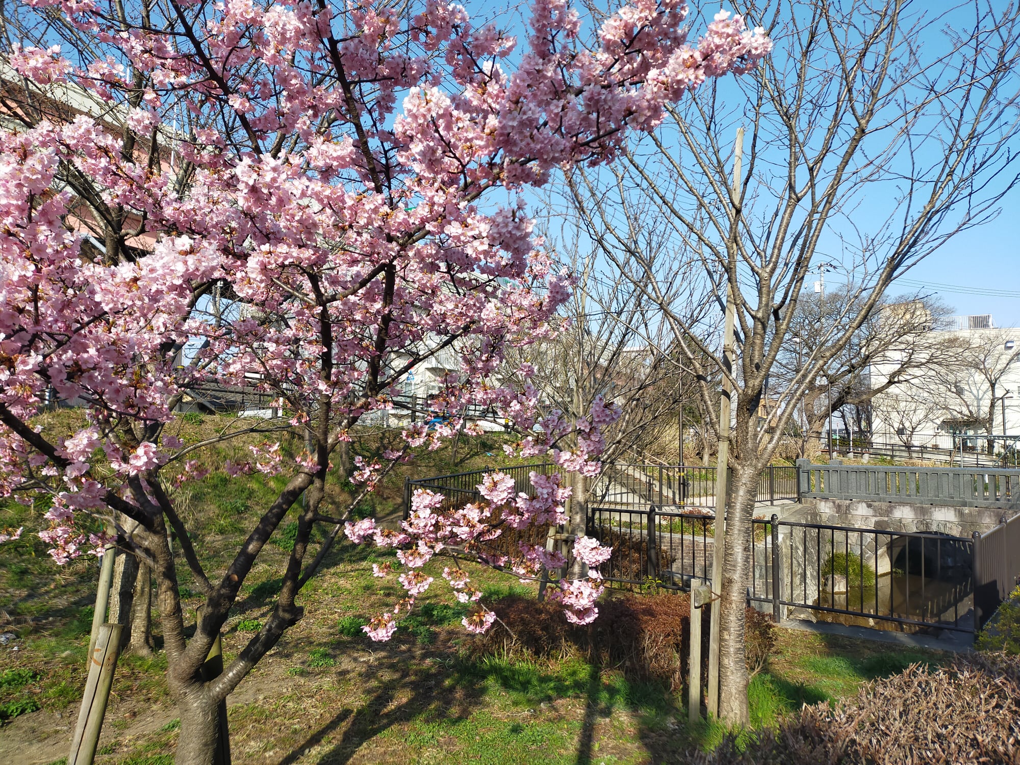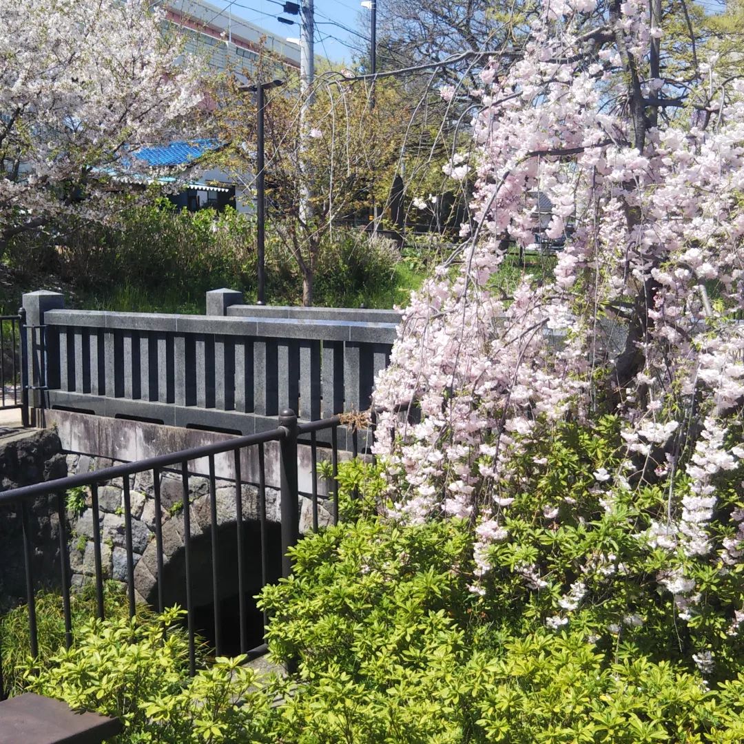 江北センターから神領堀緑道を南へ歩くと、神領堀緑道熊の木ひろば(以下、熊の木ひろば)があります。平成25(2013)年に整備された熊の木ひろばには小川が流れ、橋があり、春には様々な種類の桜が美しく咲きます。