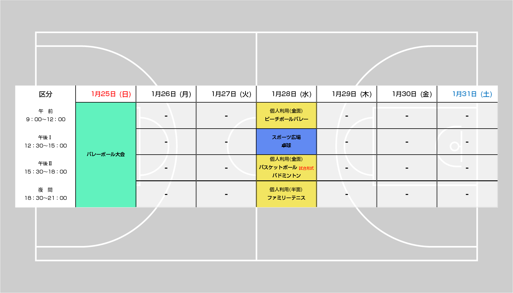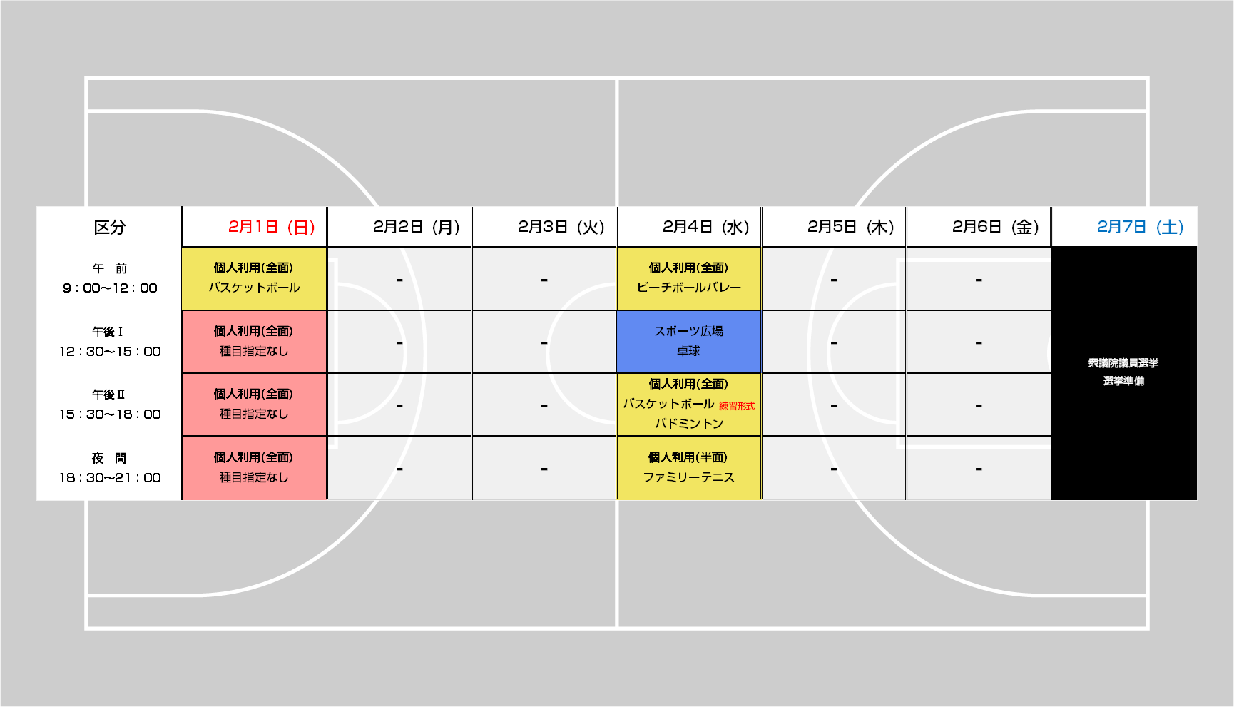 | 種目指定なし | 種目抽選のため、 利用開始時刻の10分前までに必ず集合してください。