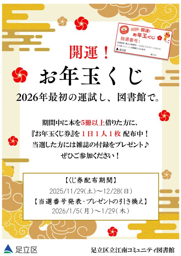 期間中に図書館の本を5冊以上貸出された方へ、1日1人1枚『お年玉くじ券』を配布中!