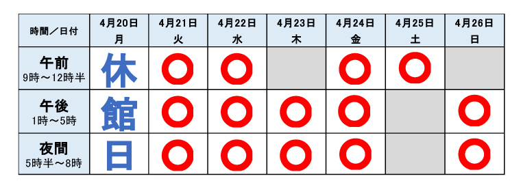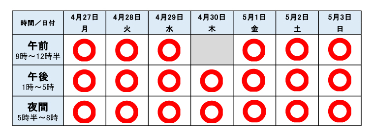 【時間】 午前9時~午後8時 ※午前のみ、午後のみ、夜間のみの場合あり、中学生は午後6時まで