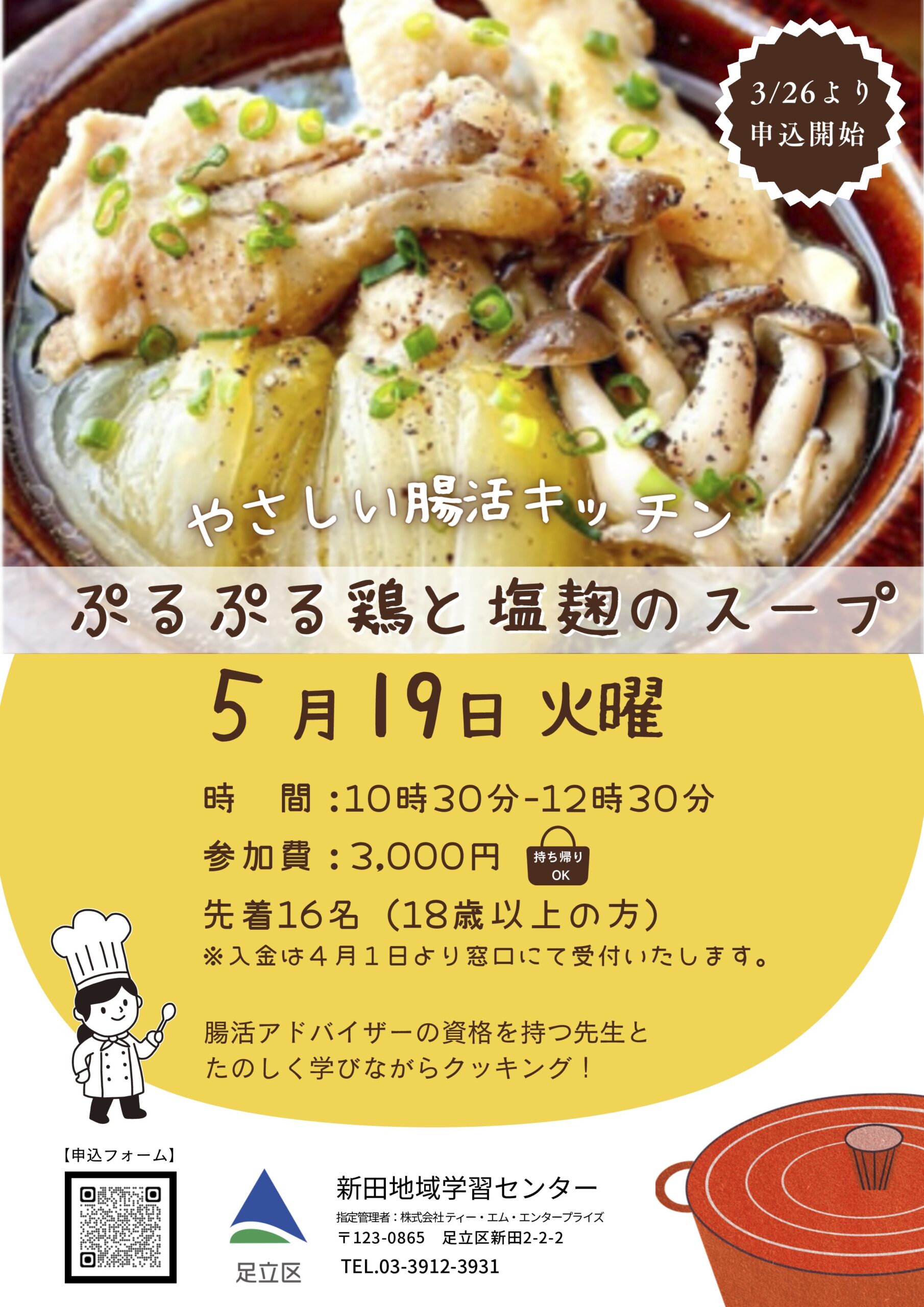 腸活アドバイザーの資格をもつ講師と一緒にスープづくりに挑戦。 毎日の食事に取り入れやすい「腸活メニュー」を、楽しく学べる料理教室です。 ※お支払いは4/1より窓口にて受付