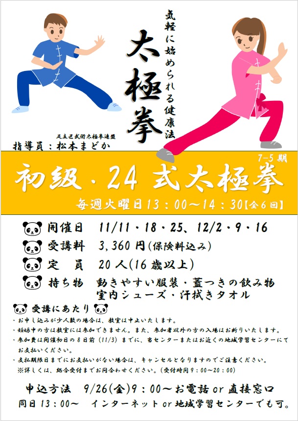 【9/26受付開始】初級・24式太極拳(6日制)
